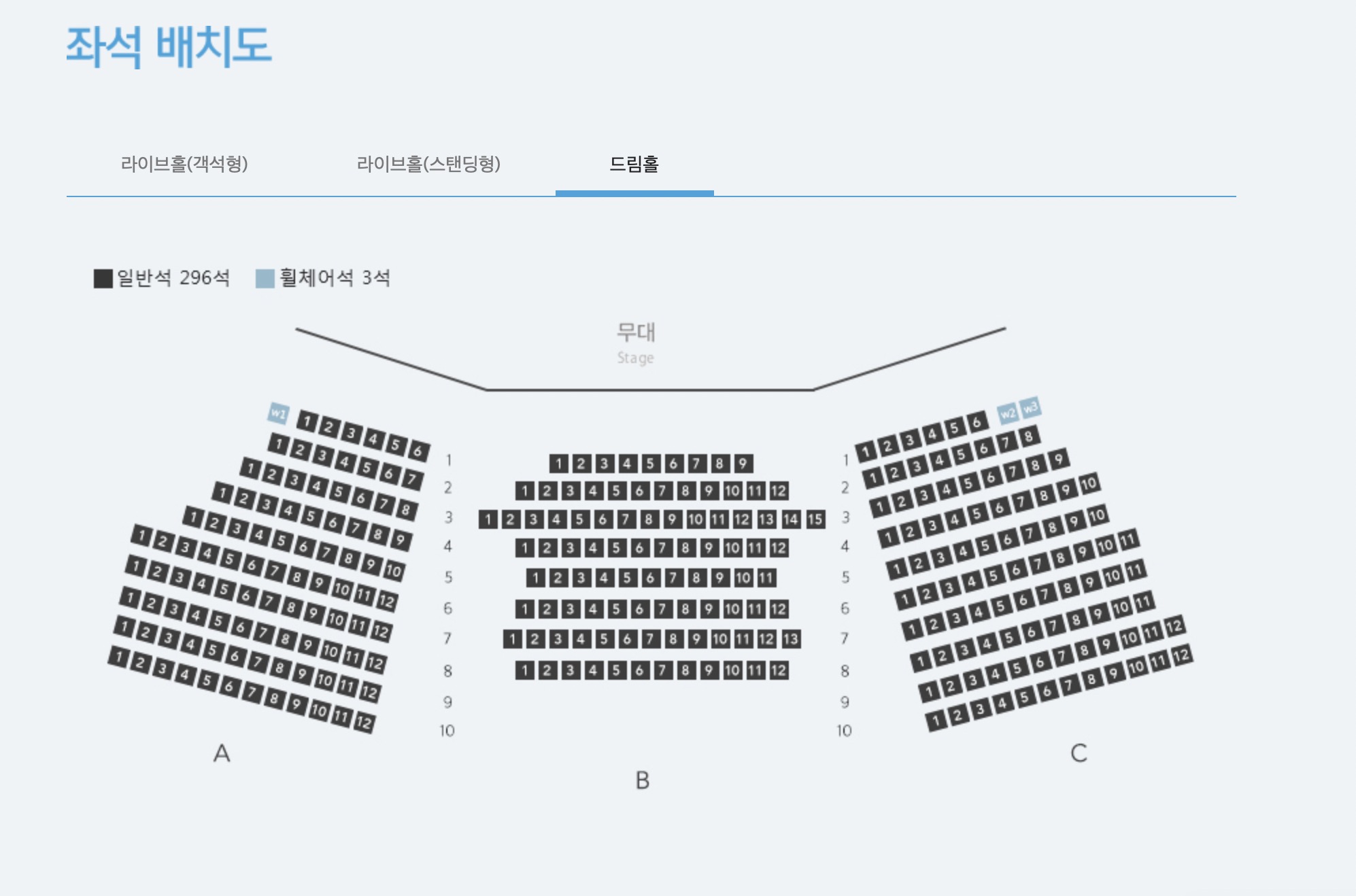 일반석 296석 + 휠체어석 3석